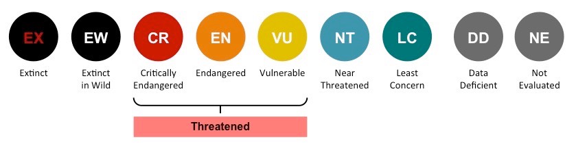 IUCN红色名录分为的9个级别。其中,高亮的红色图标是“极度濒危”(CR),意味着距离野外灭绝只有一步之遥。)